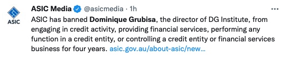 ASIC has banned Grubisa for four years from “engaging in credit activity, providing financial services, performing any function in a credit entity, or controlling a credit entity or financial services business”