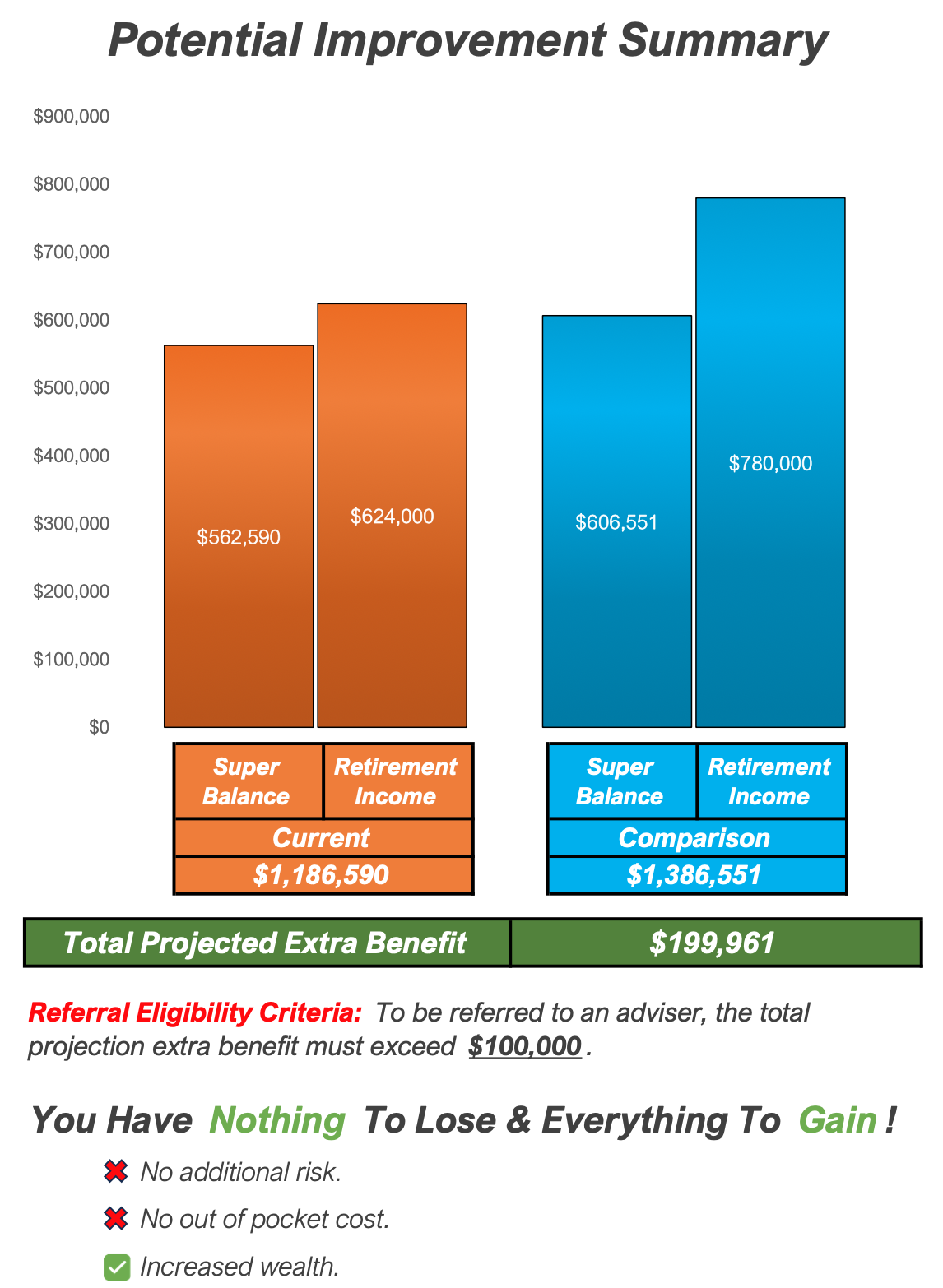 The new super fund’s 5 year return after fees was 11.79% (compared to my current fund 6.99%). The report explained that with the new product my super balance in 3 years would be about $44,000 more, and the retirement income would be about $156,000 more. These are added together to give a “total projected extra benefit” of almost $200,000. This results from some double counting because they add the super balance to the retirement income, which already includes using up the super balance (see below).
