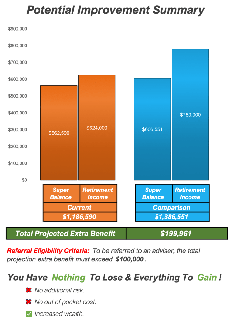 He said with my current fund I could take $54,000 per annum income once retired in two years (at 67), which would run out at 79. He told me the comparison would give me an extra benefit of $199,000. He said this is “not financial advice. It’s like going to a doctor before you have surgery”. “The Government says any advice relating to superannuation, is paid from your super. All our advisors are checked and licensed”.