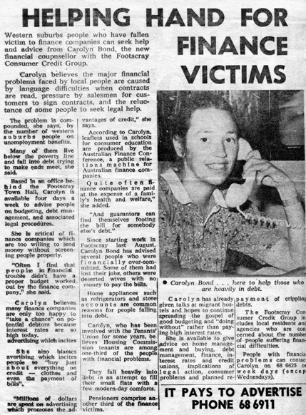When Carolyn started work as a financial counsellor in Footscray in 1981, I had my first experience dealing with credit and debt issues. The law didn’t help consumers very much, but we did what we could.
