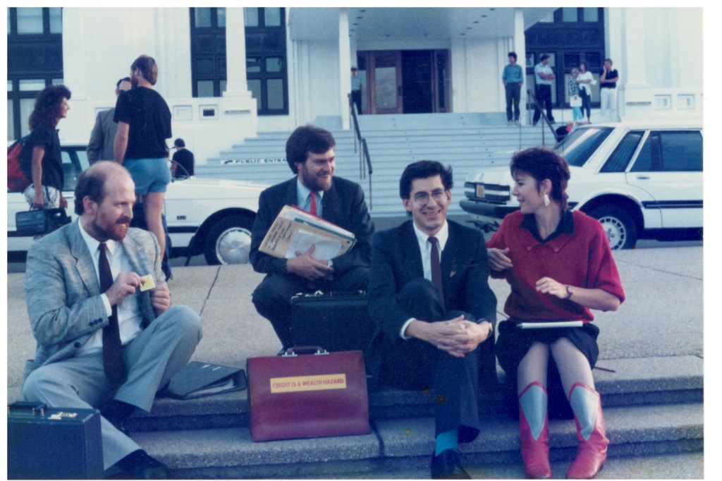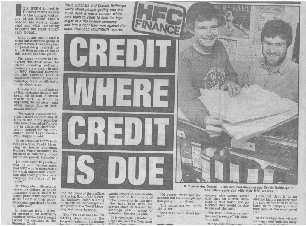 The hearing for Household Finance (HFC), which started in May 1988 and ran for over a year, was an incredible drain on our small service, which was staffed by 3 lawyers, 1 articled clerk, and 2 admin staff. HFC was a large multi-national company (and a major sponsor of the Hawthorn Football team at the time).