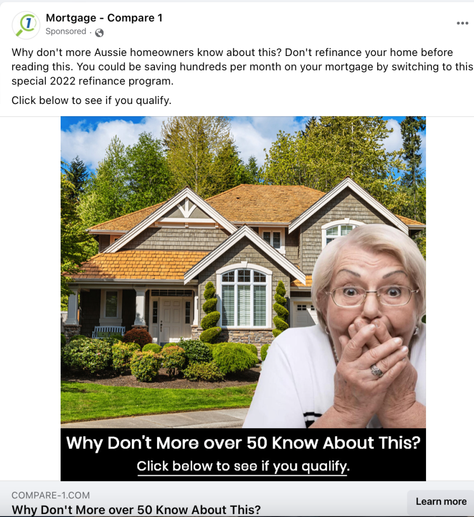 Compare-1 advertises on Facebook. Compare-1 don’t appear to have a financial services licence. The ads suggest that there is a new program, and suggests this program is time sensitive, saying “Australians over 40 Claim by October 1”.