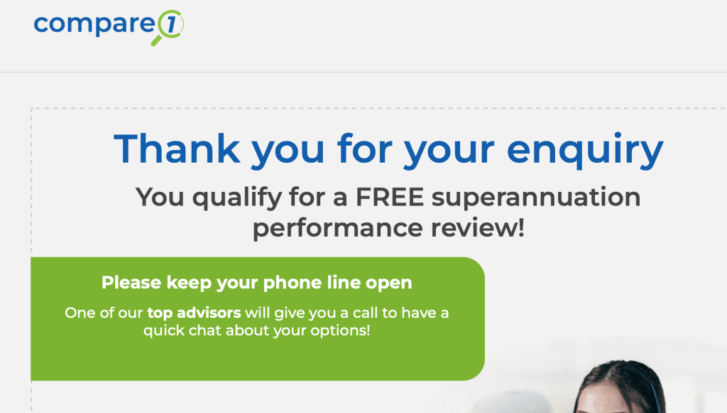 Compare-1 has a website. The website claims that “Compare 1 is a referral service regulated by ASIC”, and notes that it receives referral commissions from third-party companies. An ASIC business name search shows that the business name Compare-1 is registered by Biz Leads Pty Ltd (ABN 75 660 614 675). Biz Leads website offers businesses “verified and qualified leads, noting that they “ask prospects a range of relevant questions and filter them based on their response”. They provides leads to a range of financial services (superannuation, mortgages, personal loans, debt relief) as well as solar installation and property investment.