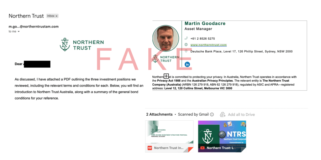 The email looked legitimate. The sender’s name was the same as an employee of the legitimate company (including a photo). All links in the email went to the website of the legitimate company which holds an AFSL.